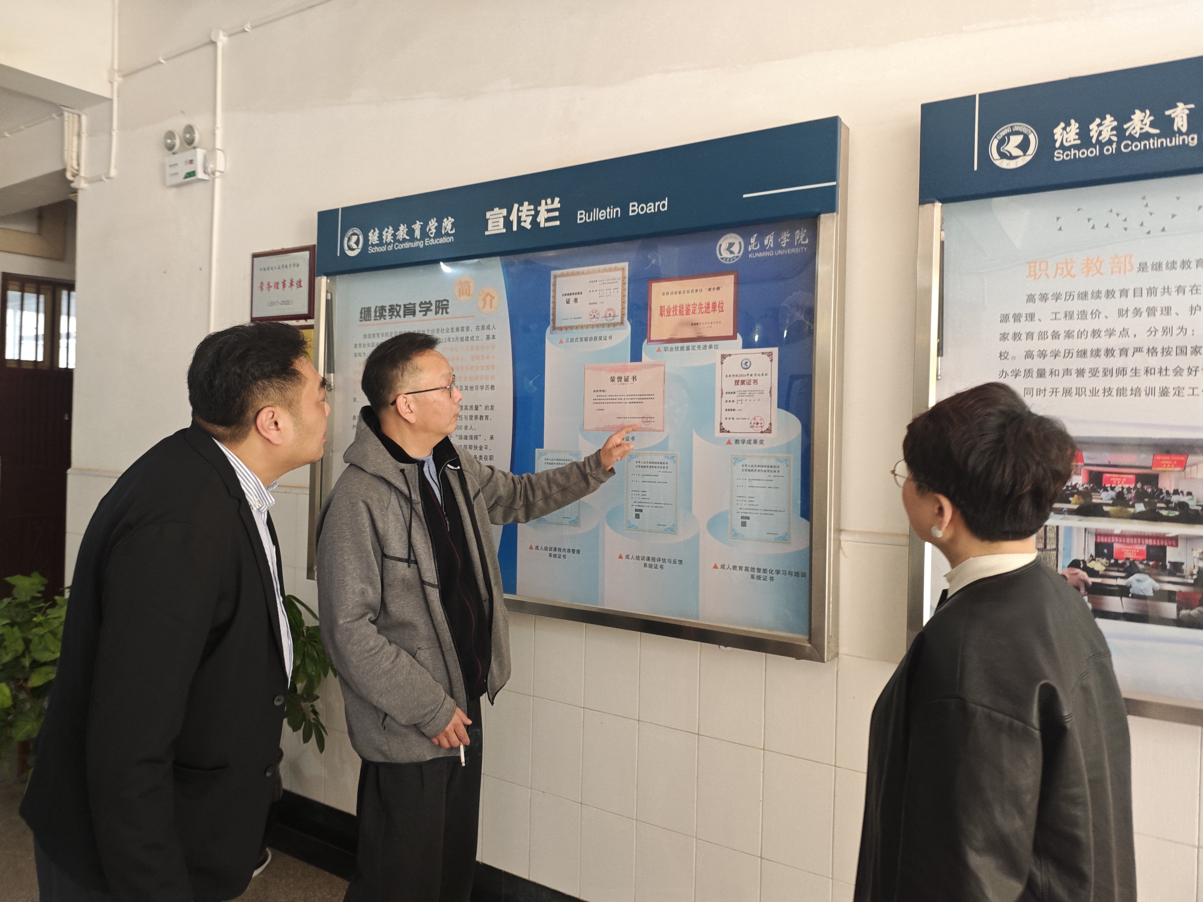 交流会后,在昆明学院继续教育学院领导的陪同下,我院交流团参观了学院宣传展示墙,全面了解了昆明学院继续教育的发展历程、办学成果与特色品牌建设情况,直观感受到了其深厚的办学积淀与清晰的发展脉络。